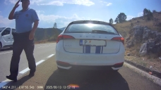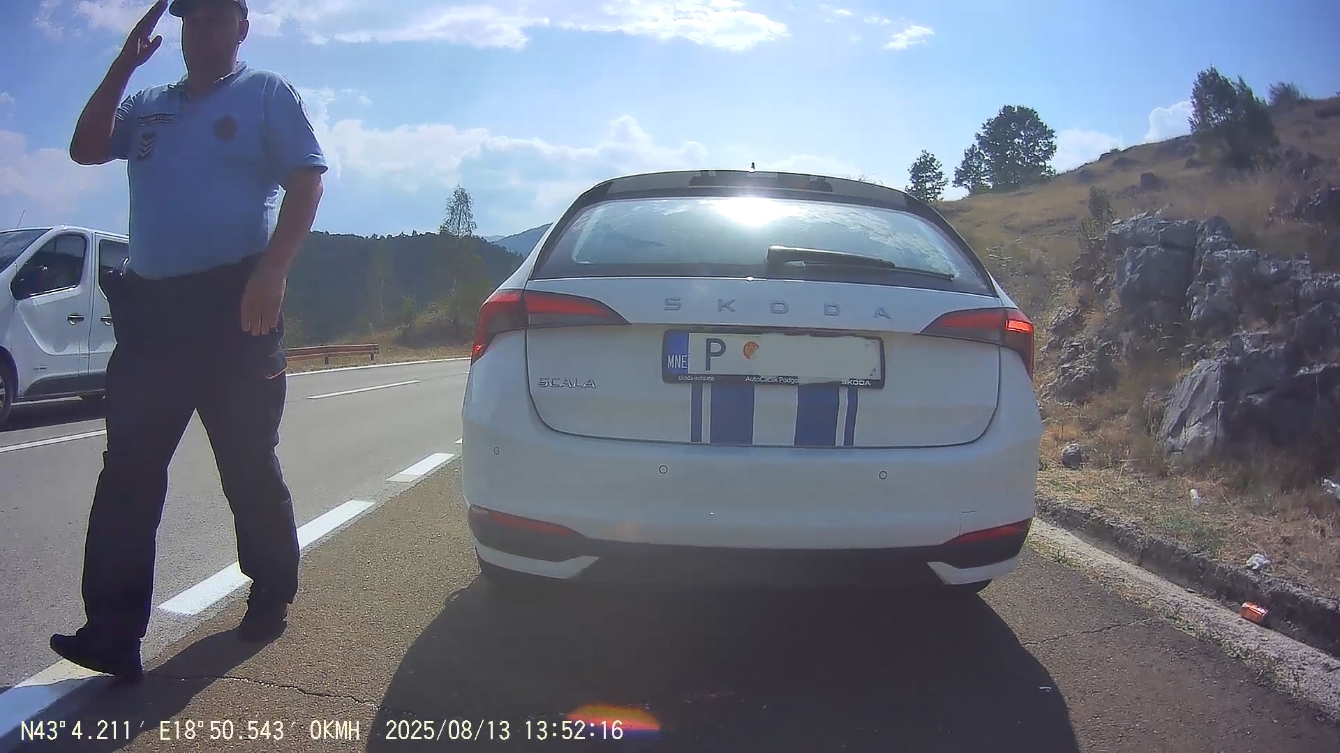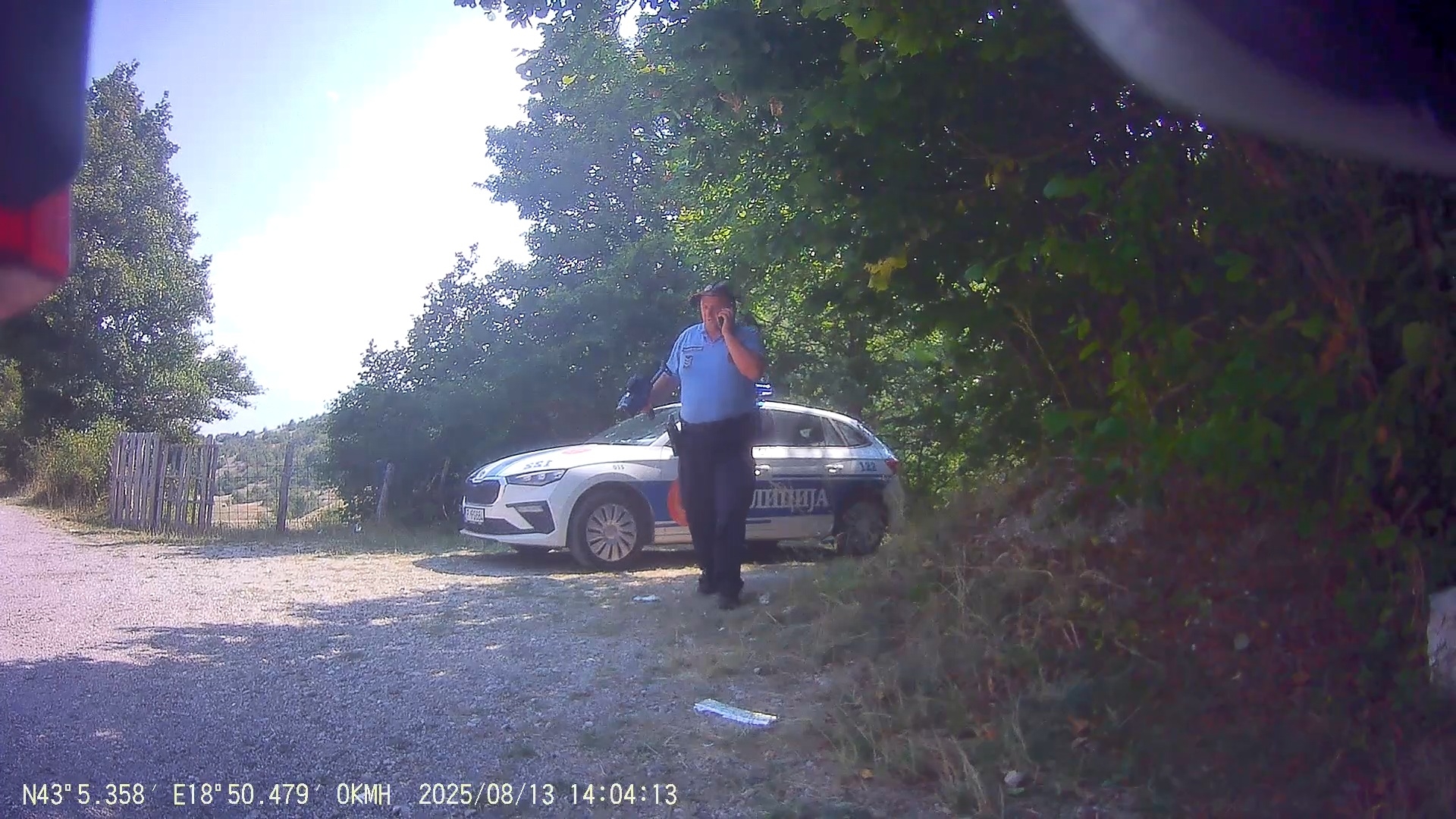 Na kraji města Gacko stojí v křižovatce policejní auto s řidičem za volantem a otevřenými dveřmi, druhý mě ukazuje k zastavení.
