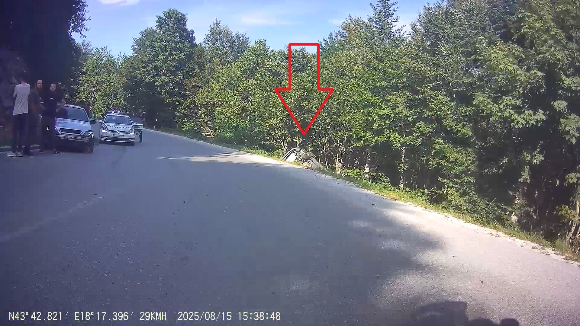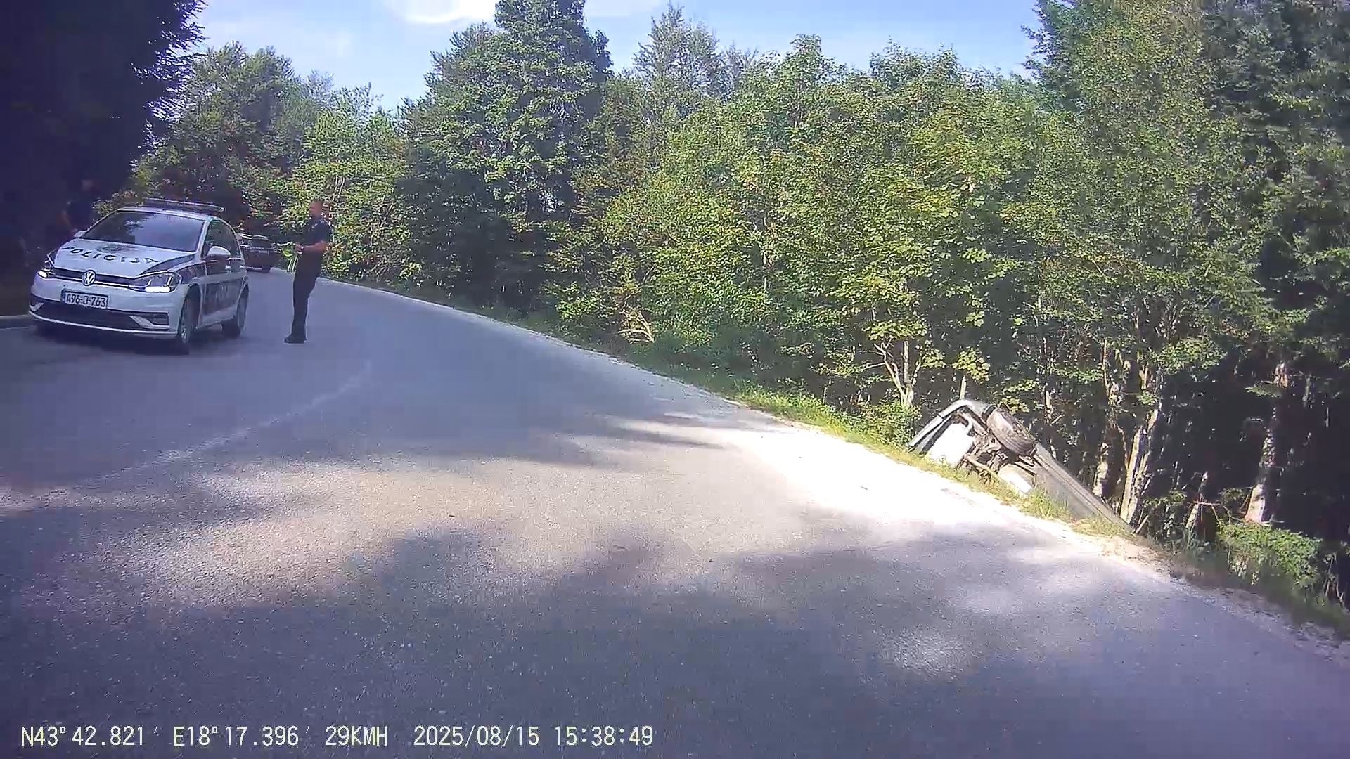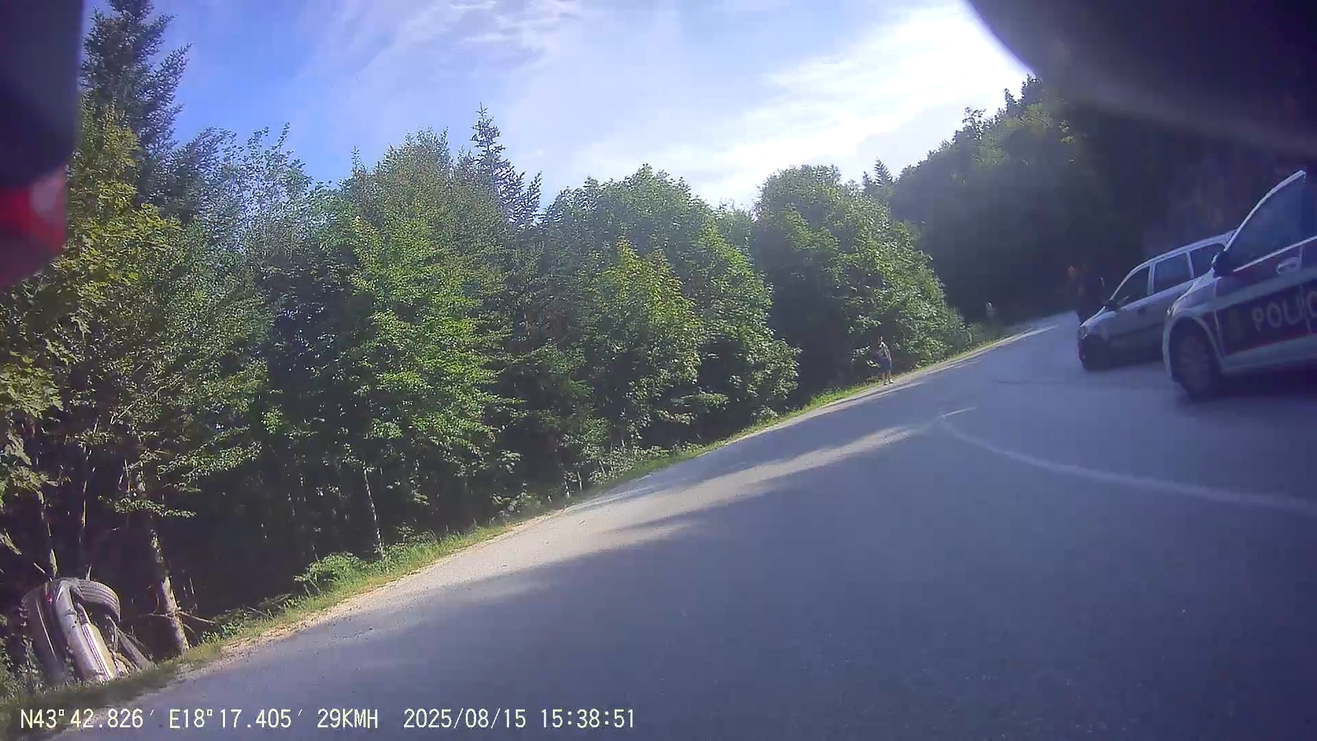 Při sjezdu k Babin Do opět policejní majáky, tentokrát ne pro mě. Jedno auto s viditelně poškozeným předkem je u krajnice, z druhého větší čouhá z příkopu jen roh zadního nárazníku.